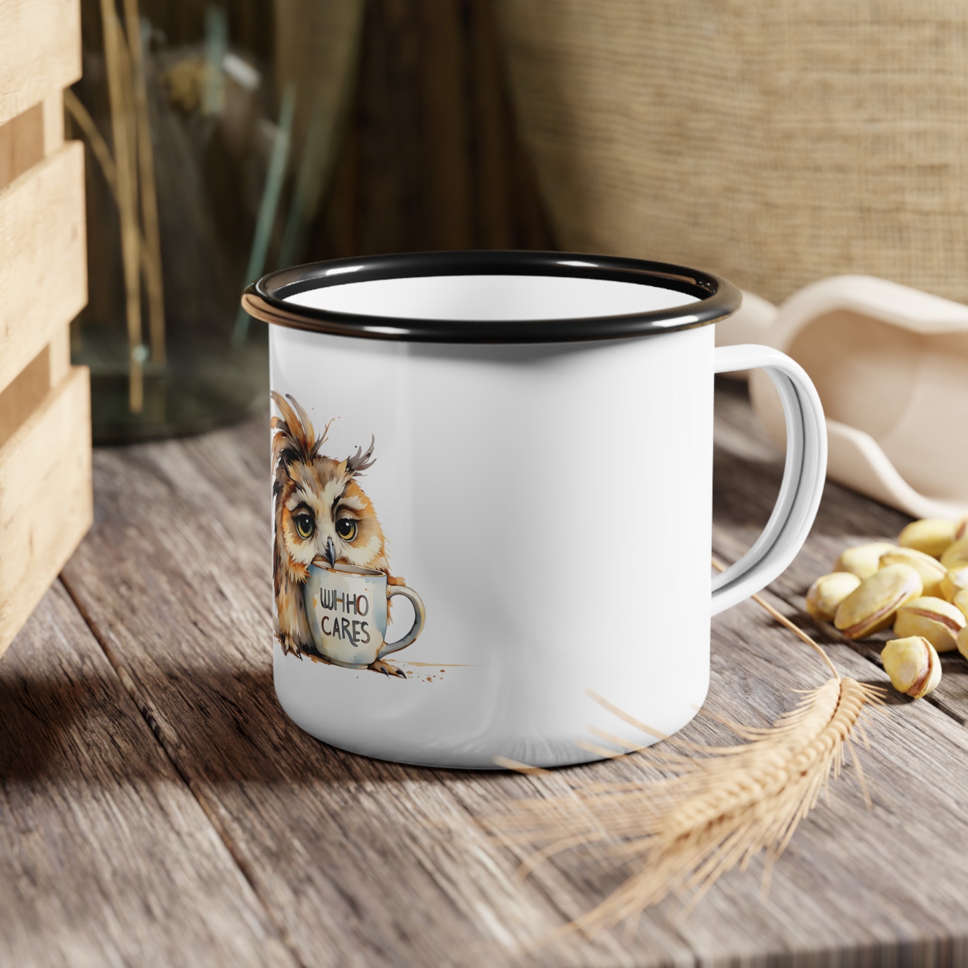 This enamel camp cup brings a touch of woodland humor to slow mornings and windblown afternoons. The glossy white surface showcases a watercolor-style owl clutching a tiny mug that reads “Who Cares,” a little, rueful companion for campsite coffee, kitchen counters, or a windowsill full of plants. Lightweight and durable, it travels easily in a backpack and stands up to everyday use while keeping its bright artwork crisp. Bring it along to sunrise hikes, rainy-day reading sessions, or just when you need a private smile over a warm drink.